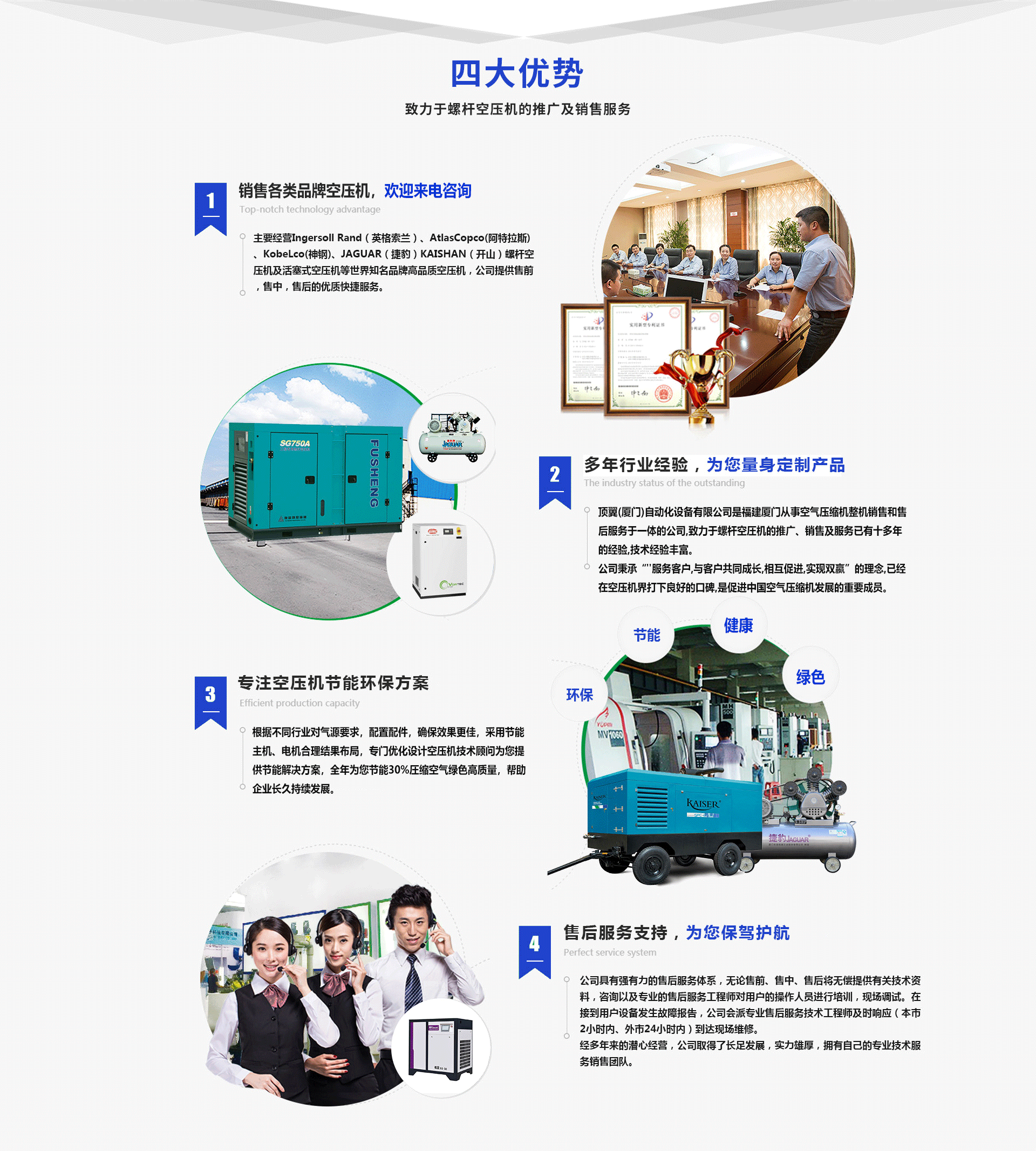 頂翼(廈門)自動(dòng)化設(shè)備有限公司是福建廈門一家從事空氣壓縮機(jī)整機(jī)銷售和售后服務(wù)于一體的公司,致力于螺桿空壓機(jī)的推廣、銷售及服務(wù)已有十多年的經(jīng)驗(yàn),技術(shù)力量強(qiáng)。 公司秉承“服務(wù)客戶,與客戶共同成長,相互促進(jìn),實(shí)現(xiàn)雙贏”的理念,已經(jīng)在空壓機(jī)界打下良好的口碑,是促進(jìn)中國空氣壓縮機(jī)發(fā)展的重要成員。公司具有強(qiáng)有力的售后服務(wù)體系,無論售前、售中、售后將無償提供有關(guān)技術(shù)資料,咨詢以及售后服務(wù)工程師對用戶的操作人員進(jìn)行培訓(xùn),現(xiàn)場調(diào)試,在接到用戶設(shè)備發(fā)生故障報(bào)告,公司專門會(huì)派售后服務(wù)技術(shù)工程師及時(shí)響應(yīng)(本市2小時(shí)內(nèi)、外市24小時(shí)內(nèi))到達(dá)現(xiàn)場維修。 經(jīng)多年來的潛心經(jīng)營,公司取得了長足發(fā)展,實(shí)力強(qiáng),擁有自己的技術(shù)服務(wù)銷售團(tuán)隊(duì)。主要經(jīng)營IngersollRand(英格索蘭)、AtlasCopco(阿特拉斯)、KobeLco(神鋼)、JAGUAR、(捷豹)KAISHAN(開山)螺桿空壓機(jī)及活塞式空壓機(jī)等品牌空壓機(jī),公司提供售前,售中,售后的快捷服務(wù)。